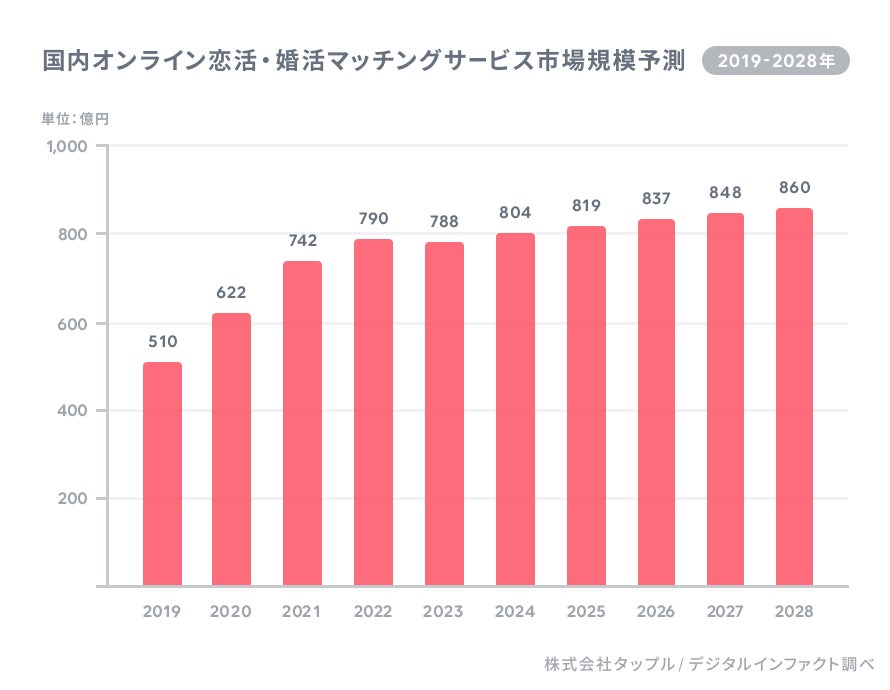 株式会社タップル(本社:東京都渋谷区、代表取締役社長:飯塚勇太)は、株式会社デジタルインファクト(本社:東京都文京区、代表取締役社長:野下智之)と共同で、恋愛や結婚対象となるパートナーをオンライン上で紹介するオンライン恋活・婚活マッチングサービスに関して、国内の市場規模を調査いたしました。調査結果は以下のとおりです。