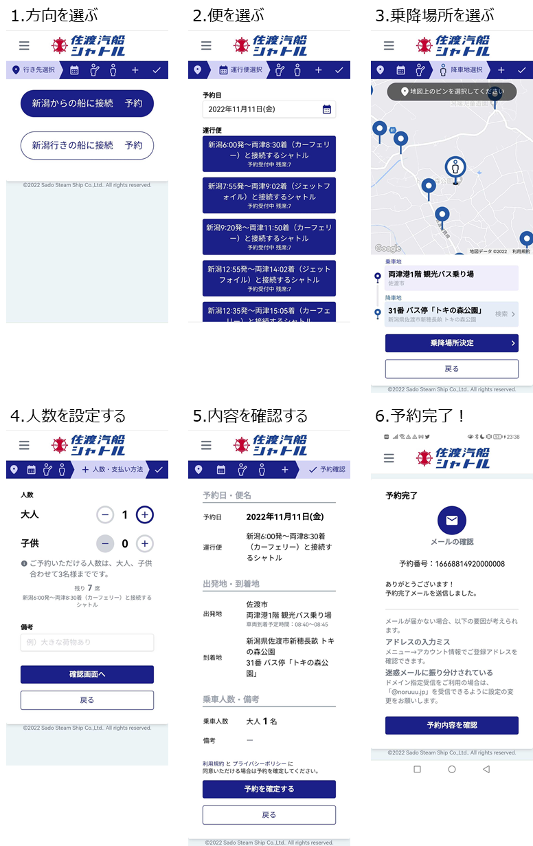利用希望者は専用ウェブサイトから乗船予定の船の日付と便を選び、利用したい乗降場所を選択することで簡単に予約することができます。佐渡汽船の予約センターへの電話で予約いただくことも可能です(ただし一部の時間帯の便を除く)。