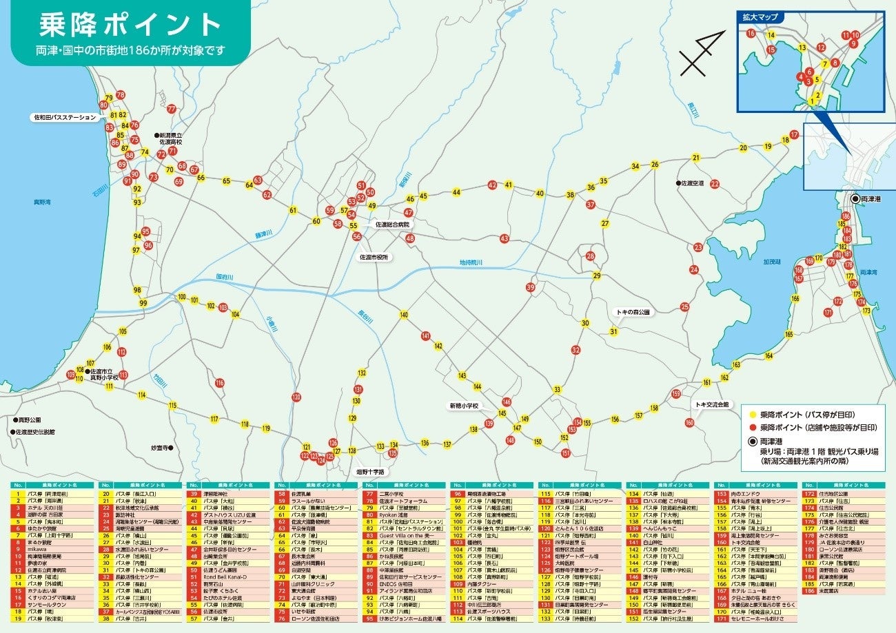 乗降場所は島内の両津地区と国中地区の市街地エリアを対象に186か所設定しました。そのうち98か所は既存のバス停付近を、その他の88か所は旅館・ホテルや店舗等の各種施設を目印として新たに設けています。これらの中からリクエストされた場所と両津港を結ぶ交通サービスを佐渡汽船の船便ごとに運行することで、高い利便性を実現します。