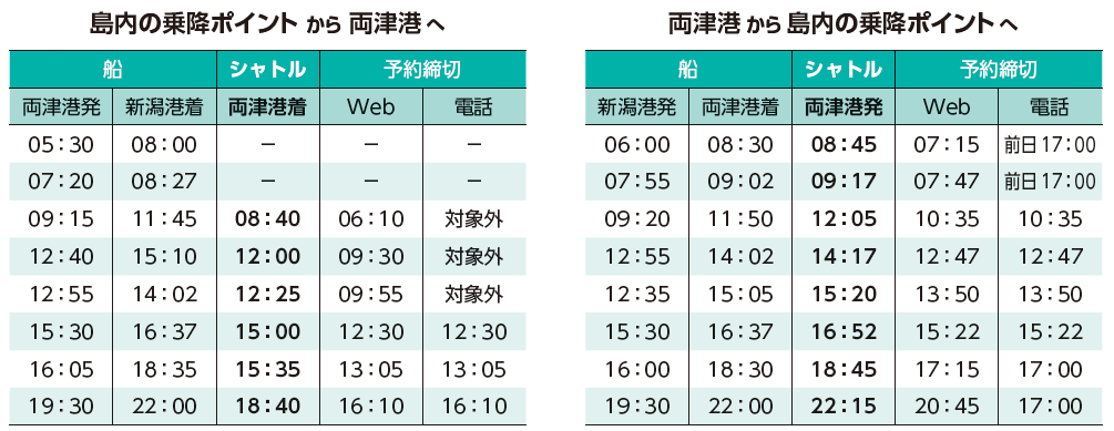 対応する船便:全便(ただし 5:30両津発、7:20両津発を除く)