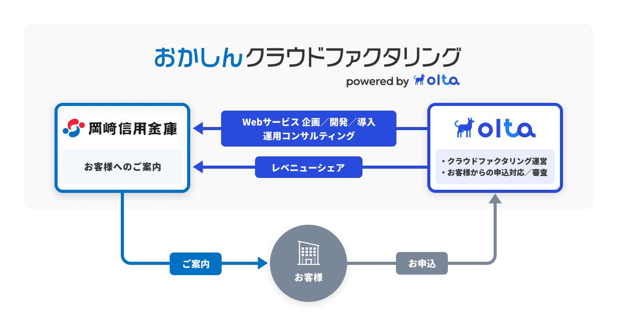 OLTAと岡崎信用金庫とのクラウドファクタリング事業における提携では、OLTAがWebサービスの企画・開発・導入および運用におけるコンサルティングを岡崎信用金庫に提供し、岡崎信用金庫は法人・個人事業主のお客様にサービスをご案内します。