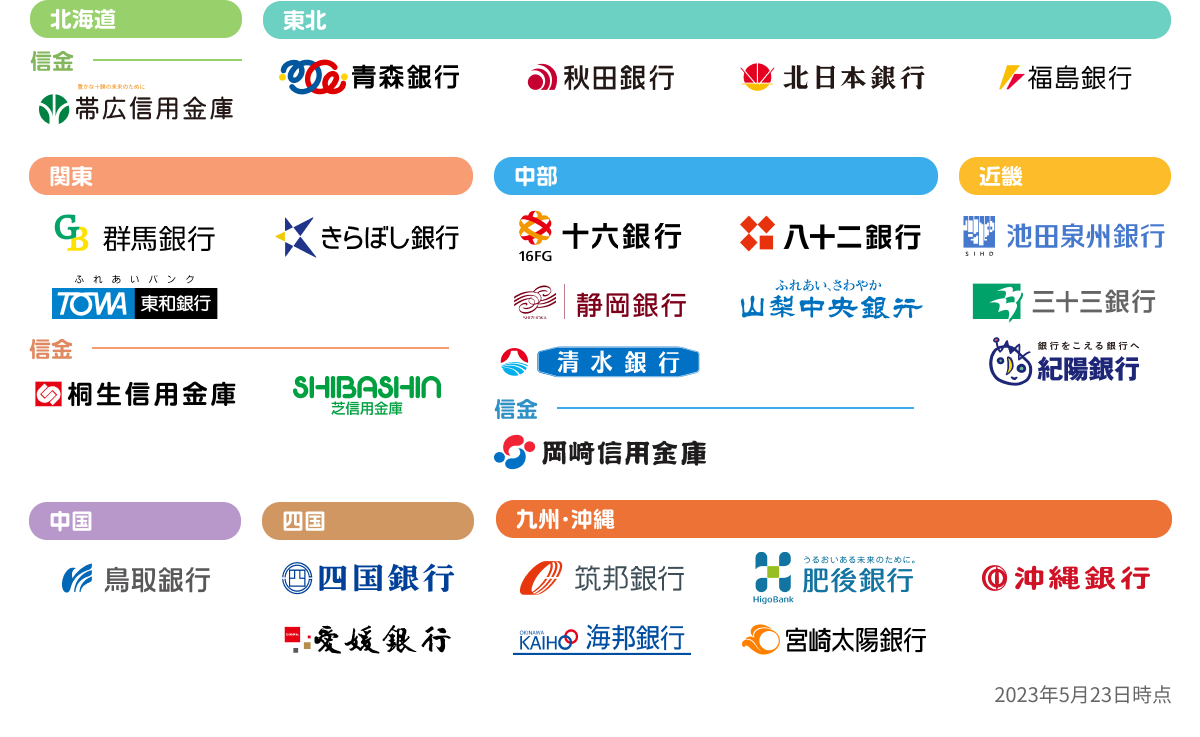鳥取銀行、筑邦銀行、八十二銀行、肥後銀行、四国銀行、池田泉州銀行、秋田銀行、三十三銀行、愛媛銀行、北日本銀行、沖縄銀行