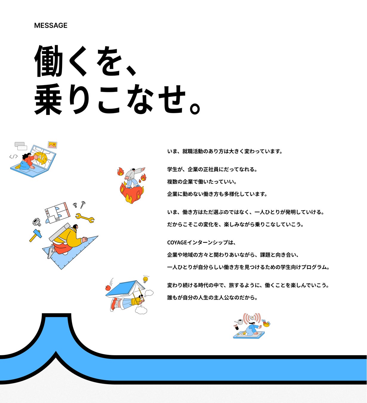 Coyageインターンシップは、学生が企業や地域の方々と関わりあい、企業理解を深めながら、一人ひとりが自分らしい働き方を見つけるためのインターンシッププログラムです。