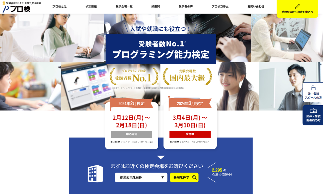 2020年12月にスタートしたプロ検は、主旨にご賛同いただいたプログラミングスクール、学習塾、パソコン教室、学校、学童など、多様な教育機関にて実施されており、子ども達のプログラミング学習への意欲喚起や学習継続のきっかけとして、また、受験者や教育者が個人のプログラミング能力・技能を可視化した上で、効果的な学習・指導に繋げることができるツールとして活用されています。