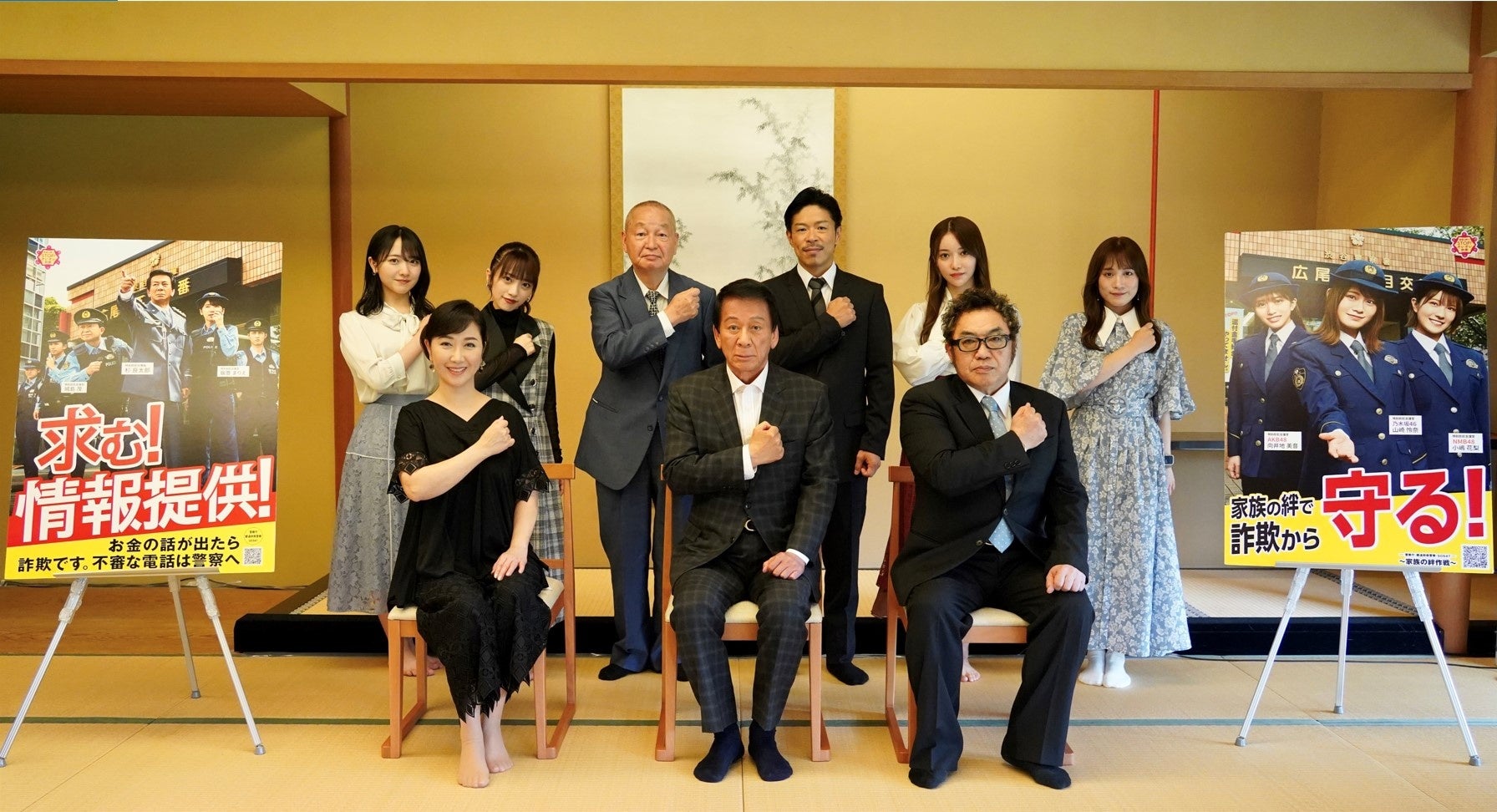 この度、「ストップ・オレオレ詐欺47~家族の絆作戦~」プロジェクトチームの対策会議が都内で開催され、特別防犯対策監の杉良太郎氏、特別防犯支援官の伍代夏子氏、コロッケ氏、EXILE 松本利夫氏、吉原朝馬氏、乃木坂46 黒見明香氏、AKB48 向井地美音氏、SKE48 斉藤真木子氏、STU48 石田千穂氏が参加し、これまでの啓発活動などを通して感じた特殊詐欺被害の現状や課題、今後の特殊詐欺根絶に向けた対策について話し合いました。