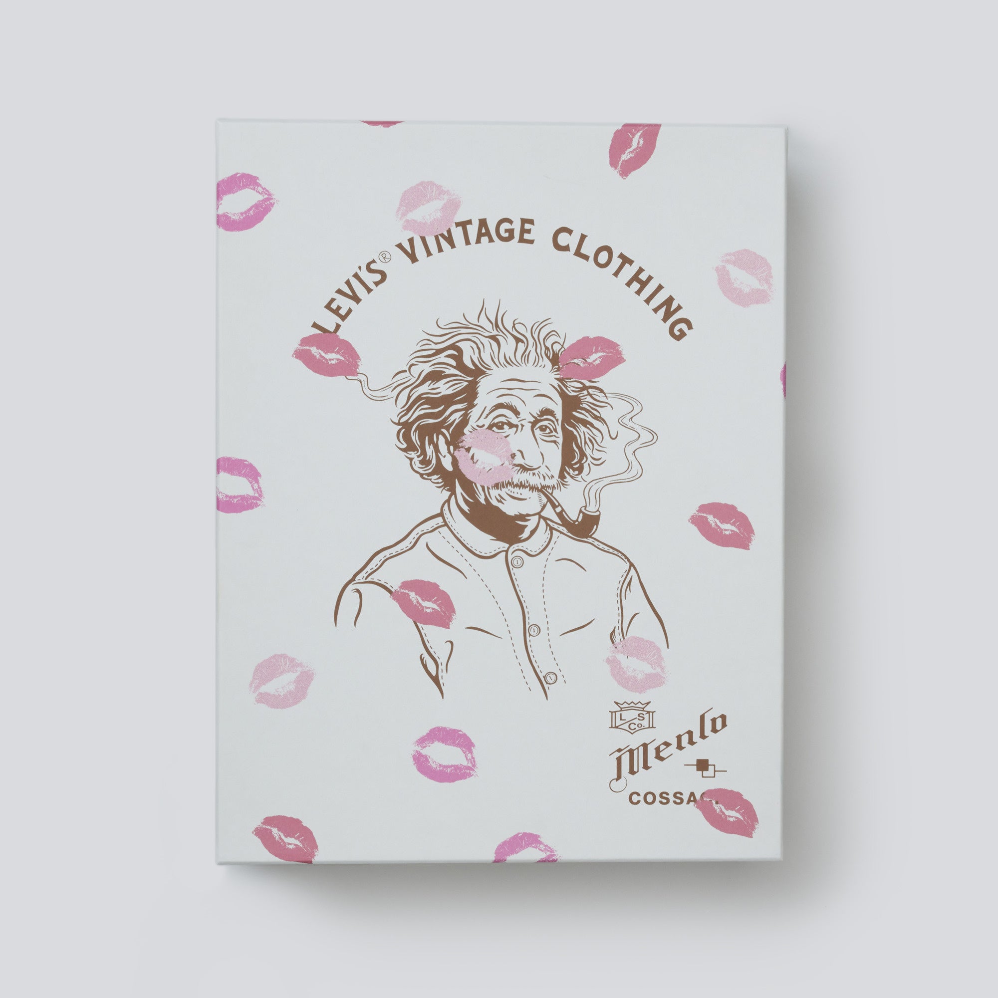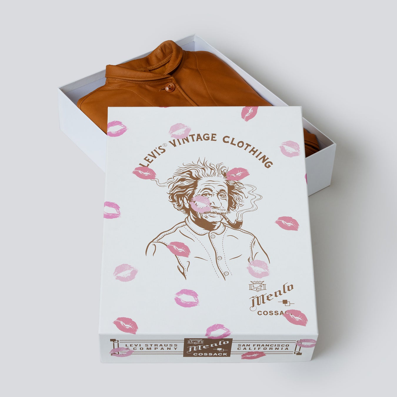 ソフトでしなやかなコニャック素材を使用したLevi’s® Vintage Clothingのウィメンズ アインシュタインジャケットは、すべてのディテールは原型を忠実に再現しつつ、ショート丈でより女性らしいシルエットに仕上げました。また2018年に販売した復刻版同様、アインシュタインジャケットのスペシャルボックスがウィメンズ仕様になり、ボックスと中のペーパーにはピンクのリップスティックのキス柄プリントが施され、ピンクのオークションパドルが付属します。このオークションパドルはLevi’s®がイギリス・ロンドンで行われたクリスティーズオークションでアインシュタインジャケットを落札した際のオリジナルパドルをモチーフとしています。