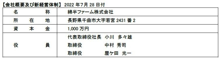 本日、綿半ホールディングス株式会社(東証プライム:代表取締役社長 野原 勇)は、子会社である綿半パートナーズ株式会社を通じて、有限会社中村ファーム(本日付で綿半ファーム株式会社へ商号変更)の全株式を取得しましたので、お知らせいたします。