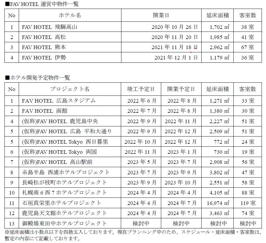 当社は観光立国の実現や地域創生への貢献を目的にアパートメントホテルの開発に取り組んでおり、全国にアパートメントホテルの展開を行っております。この度、当社のホテルブランド『FAV HOTEL』の開発用地として、新たに販売用不動産の取得をいたしました。2.本開発用地の概要
