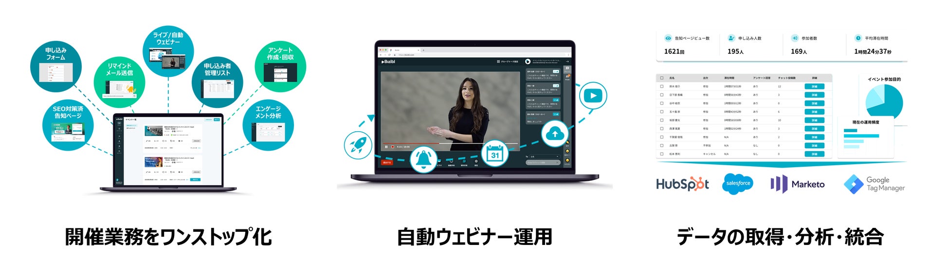 当社が提供する「Bizibl」は、ウェビナー業務の一元化と自動化で工数を削減し、アーカイブとデータ活用で成果を最大化できる、ウェビナーマーケティングSaaSです。 マーケティング利用に特化した独自開発の「ツール」だけでなく、立ち上げに必要な「企画・運用サポート」を提供することで、収益につながるウェビナーマーケティグを実現いたします。