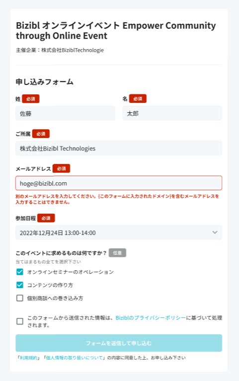 ブロック機能が設定されたイベントにおいて、該当ドメインのメールアドレスを入力すると、「別のメールアドレスを入力してください」というエラーメッセージとともに、フォーム送信ボタンが非活性となり、申し込み不可となります。