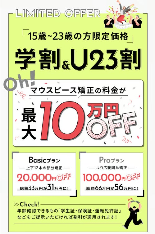 コロナ禍以降の自己投資トレンドを背景に、若年層のリアルな矯正事情と価値観が浮き彫りになった本調査結果とあわせ、15〜23歳限定のお得なマウスピース矯正プラン「学割&U23割(最大10万円OFF)」を発表します。