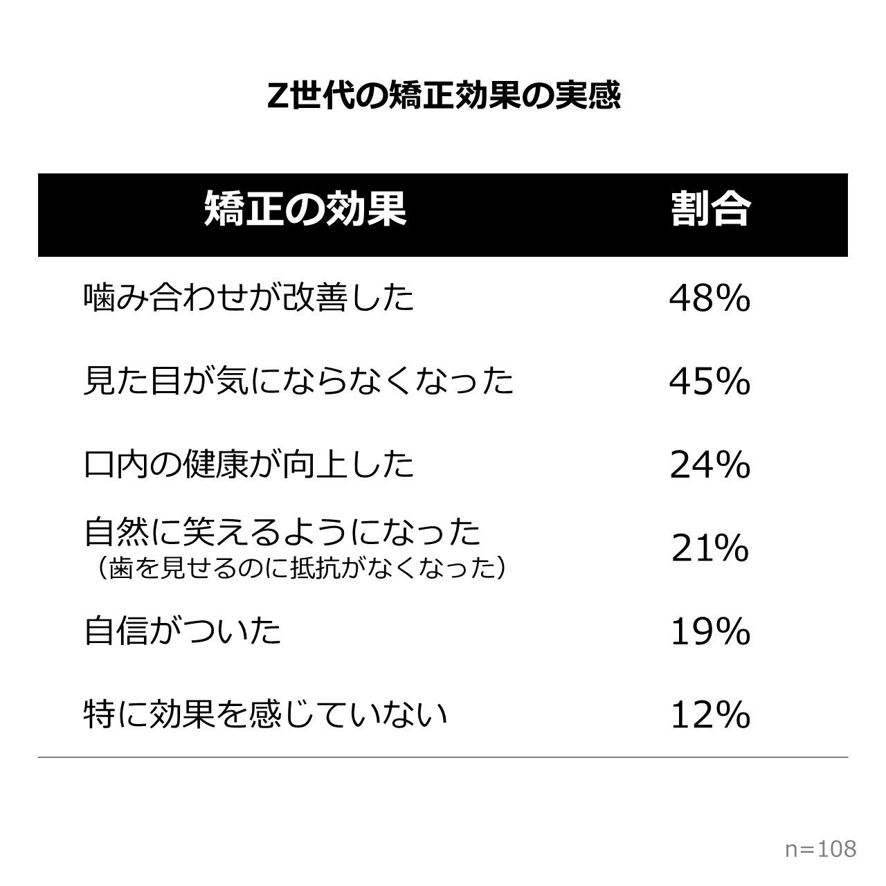 歯科矯正の具体的な効果としては、「噛み合わせが改善した」(48%)と「見た目が気にならなくなった」(45%)が上位に。次いで「口内の健康が向上した」(24%)、「自然に笑えるようになった(歯を見せるのに抵抗がなくなった)」(21%)、「自信がついた」(19%)などが挙がり、機能面・審美面の両方で高い満足感を得ていることが分かりました。