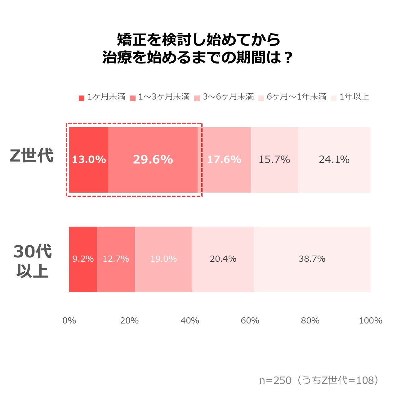 矯正を検討し始めてから実際に治療を開始するまでの期間を調査したところ、Z世代では「3ヶ月未満」で治療を開始した人が42.6%にのぼりました(「1ヶ月未満」13.0%と「1ヶ月~3ヶ月未満」29.6%の合計)。