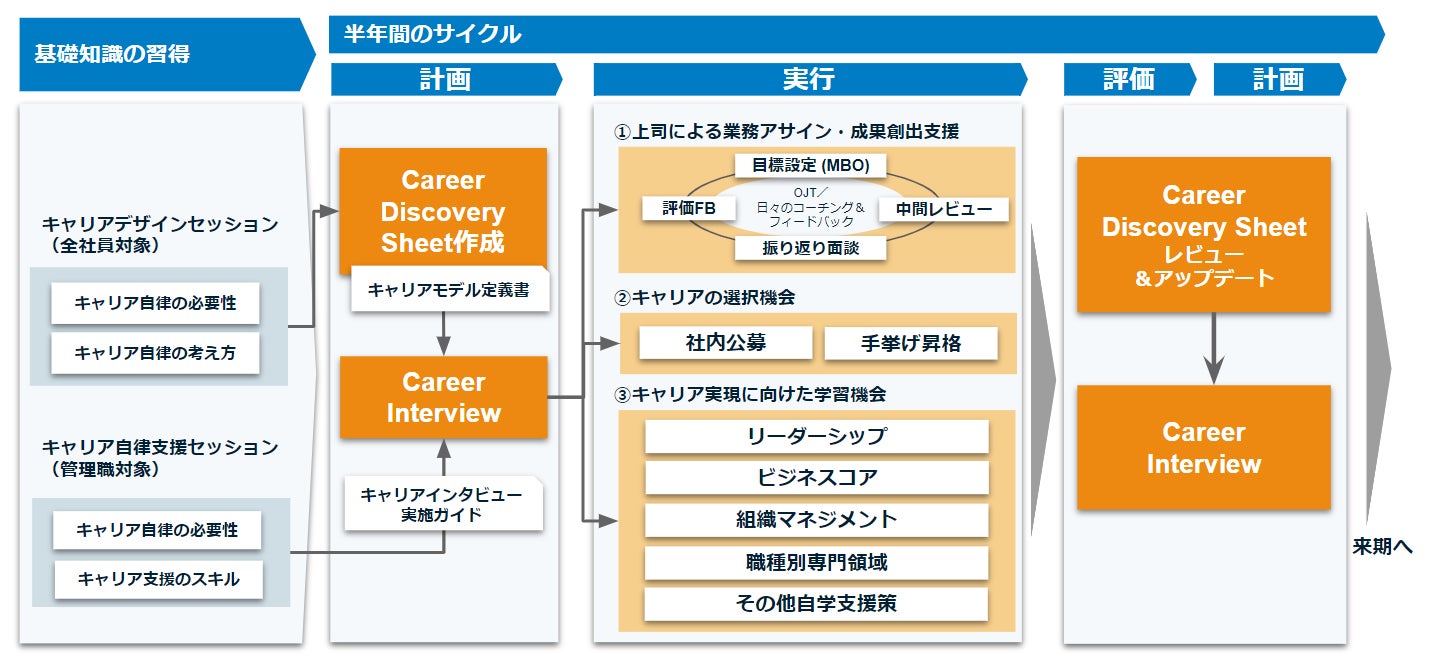 WHIはそのしくみとして、「計画・実行・評価」の3フェーズから成る半年間の施策サイクルを定義しました。まずはキャリア自律の必要性や方法を学んだ上で、期初に自身のキャリア志向を考える面談を実施します。目標の実現に向けた経験やスキルアップを経て、社内公募による異動や、手挙げによる昇格にチャレンジ。期末に振り返りを行います。このサイクルを持続的に回し続けることにより、社員一人ひとりが自律的キャリアを形成し、成長し続けるサポートを行います。