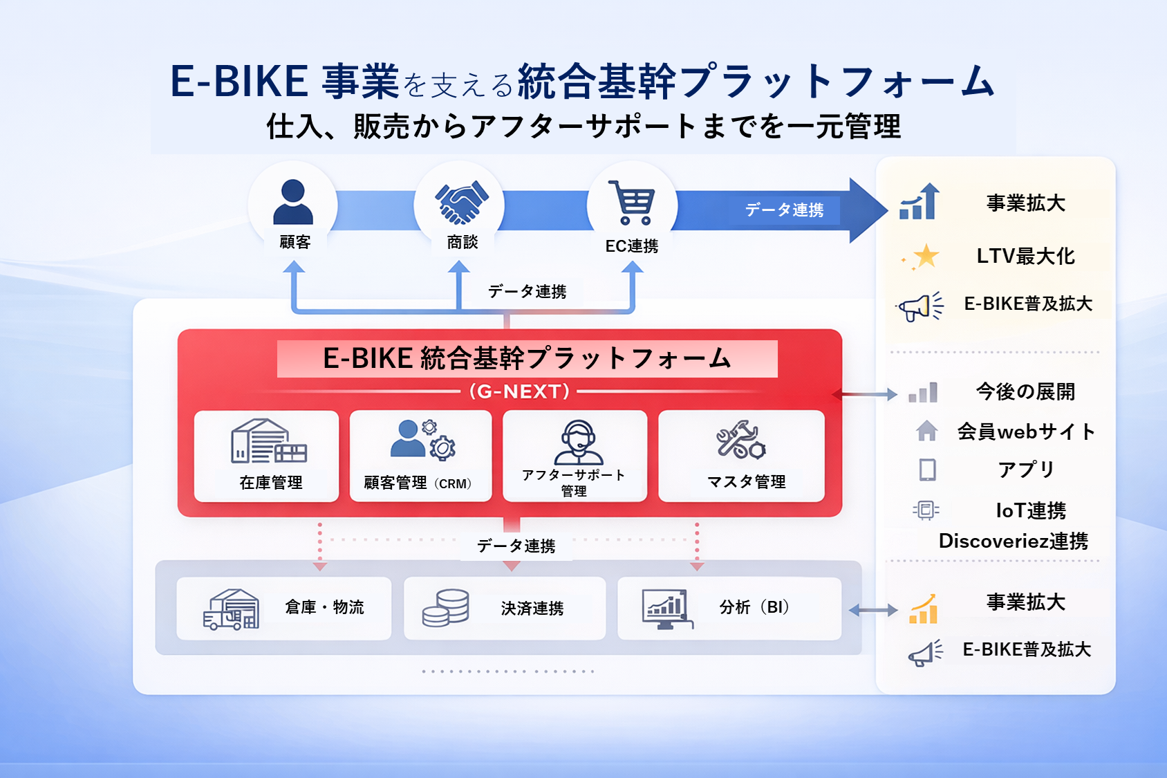 E-BIKE(電動アシスト付自転車)は高単価かつアフターサポートが重要な商材であるため、販売後の体験設計までを前提とした基幹設計が不可欠です。本基盤は、仕入、販売から保守までを一気通貫で管理できるE-BIKE専用業務基盤として設計しております。