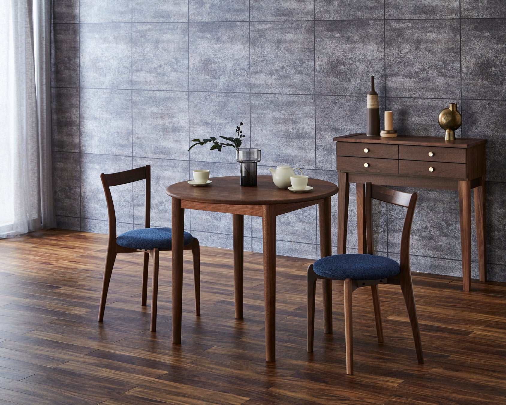マルトテーブルの脚には円錐脚を採用。同じデザインでセンターテーブル用の脚も展開しているため、リビングとダイニングでそろえることも可能です。