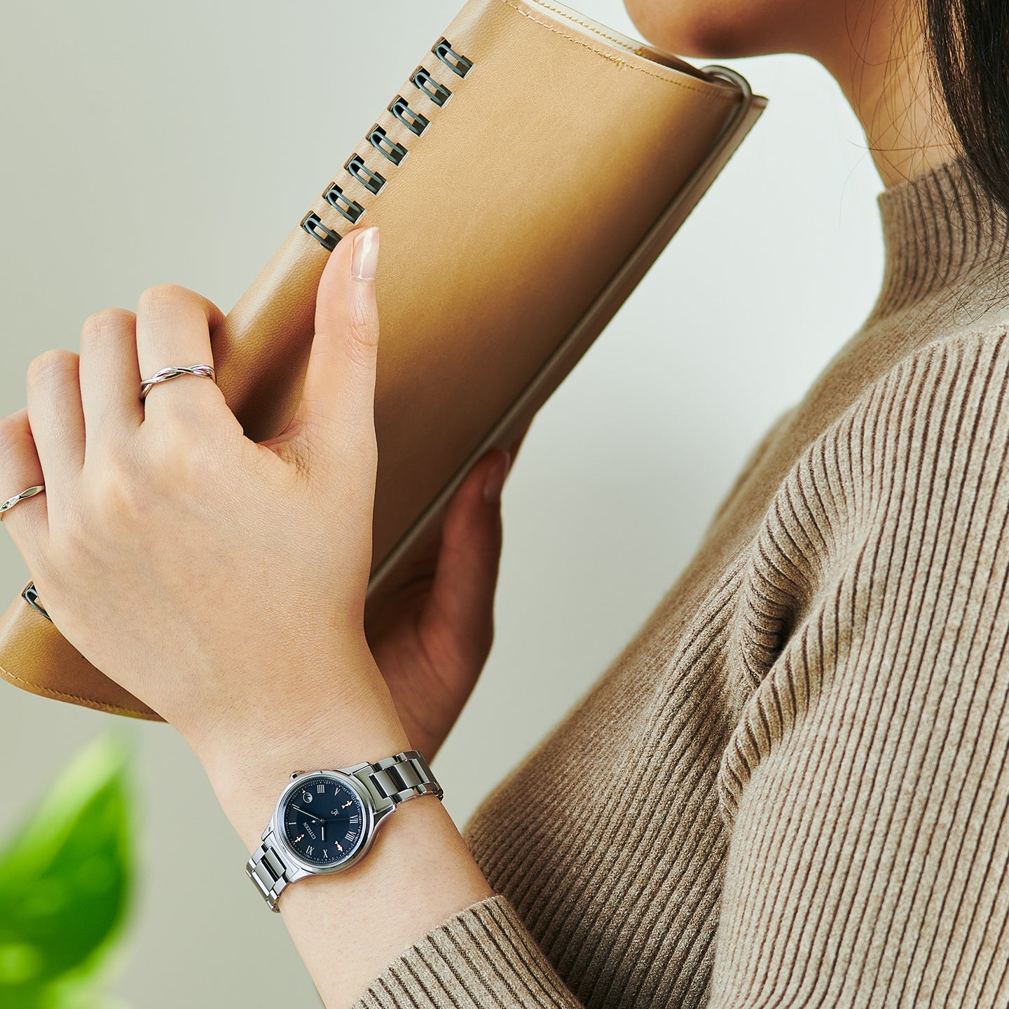ケースには、軽量でキズに強く、肌に優しいスーパーチタニウムTM※4を採用。肌を明るく美しく魅せるサクラピンク(R)※5とエターナルプラチナTM※6を組みあわせたモデルをはじめ、ダークネイビーの文字板にエターナルプラチナTMを組み合わせたモデル、デュラテクトゴールドとブラックのアップルレザー※7を合わせた3モデルが登場します。また、チタンブレスレットで初めて、ご自身でバンドの長さ調整ができる「シンプルアジャスト」を採用しました。