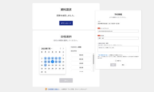 従来の日程調整ツールとは違い、資料請求時点で入力いただいた情報を保持できるため、再入力なしでアポ調整を完了させることができます。
