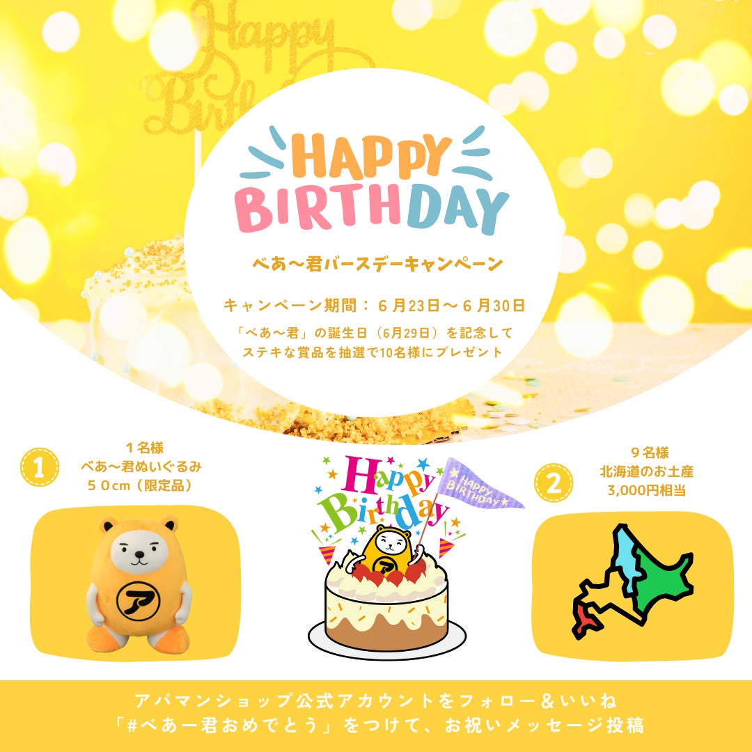 賃貸住宅仲介業店舗数No.1*のApaman Network株式会社(東京都千代田区・APAMAN株式会社の連結子会社 代表取締役社長 山﨑戒)は、当社キャラクター「べあ~君」の誕生日(6月29日)を記念し、日頃のご愛顧に感謝を込めて、SNSキャンペーンを実施いたします。本キャンペーンでは、抽選で特大サイズ(50cm)の「べあ~君ぬいぐるみ」や北海道のお土産をプレゼントします!べあ~君をいつも応援してくださる皆様へ、感謝の気持ちを込めた特別な企画です。さらに、誕生日を盛り上げるためのスペシャル企画として、インスタライブを3日間にわたり開催いたします。