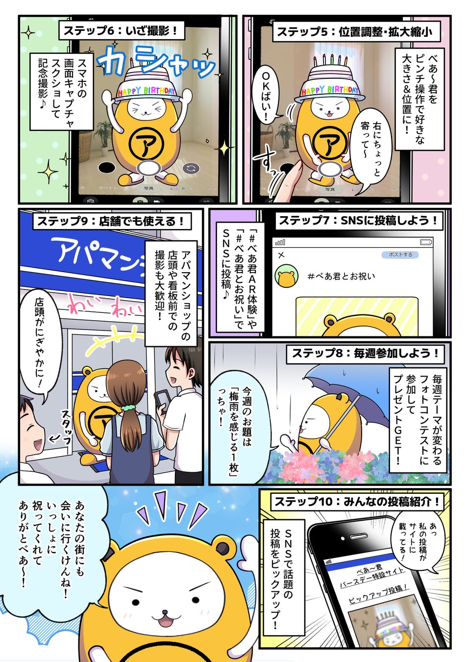 1.アパマンショップ公式Instagramアカウント (@apaman_shop)をフォロー&いいね 2. ハッシュタグ「#べあー君おめでとう」をつける 3. べあ~君へ「お祝いメッセージ」やARべあ〜君と写真を撮って投稿 1.アパマンショップ公式Facebookアカウント (https://www.facebook.com/apamanshopcom)をフォロー&いいね 2. ハッシュタグ「#べあー君おめでとう」をつける 3. べあ~君へ「お祝いメッセージ」やARべあ〜君と写真を撮って投稿 X(旧Twitter) 1.アパマンショップ公式Xアカウント (@Apamanshop)をフォロー&リポスト 2. ハッシュタグ「#べあー君おめでとう」をつける 3. べあ~君へ「お祝いメッセージ」やARべあ〜君と写真を撮って投稿 |