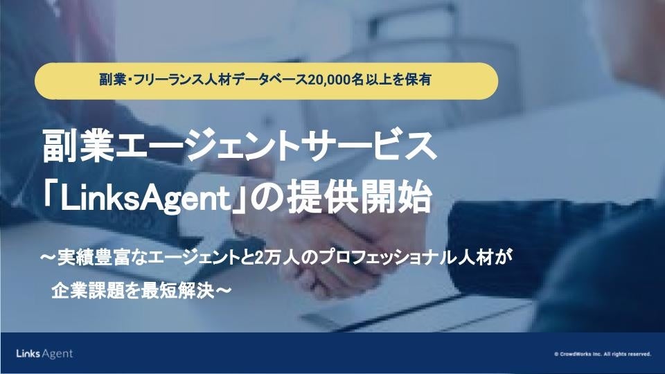 企業と個人をつなぐオンライン人材マッチングプラットフォームを開発・運営する株式会社クラウドワークス(本社:東京都渋谷区 代表取締役社長 兼 CEO:吉田 浩一郎 以下「当社」)は、当社が運営する副業・兼業のマッチングサービス「CrowdLinks(クラウドリンクス)」において、副業エージェントサービス「LinksAgent(リンクスエージェント)」を開始します。実務経験豊富なエージェントとクラウドリンクスに登録する2万人のプロフェッショナル人材が企業課題を最短で解決し、全ての働く人と企業がWin-Winとなる社会の実現を目指します。