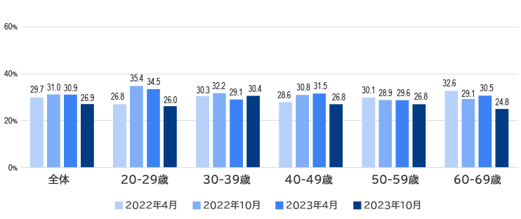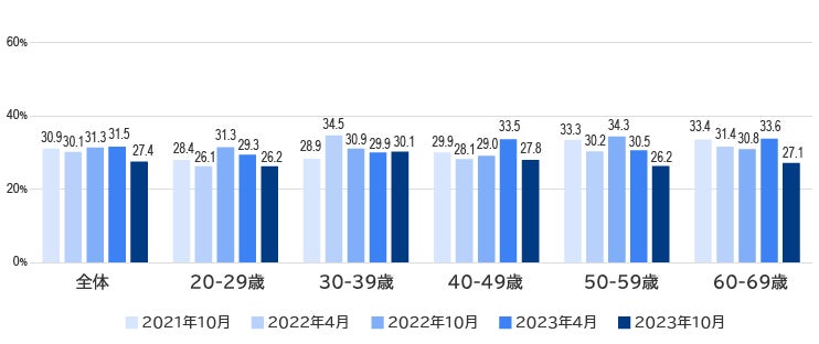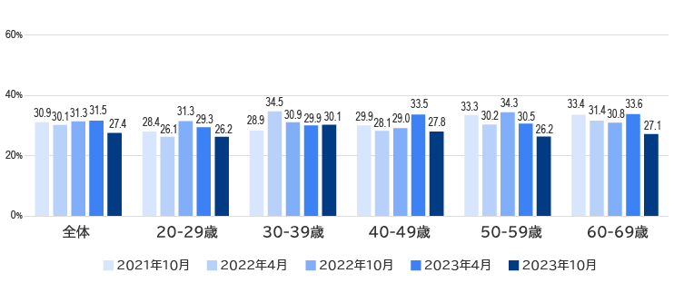 年代別では、60-69歳の低下が最も大きく、前回調査の33.6%から6.6pt低下して、27.1%となった。40-49歳も前回調査から5.6pt低下した。30-39歳は横ばい。