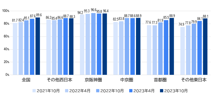 地域別にみると、これまで最も高かった京阪神圏で前回調査の47.2%から8.0pt低下して、39.3%となった。