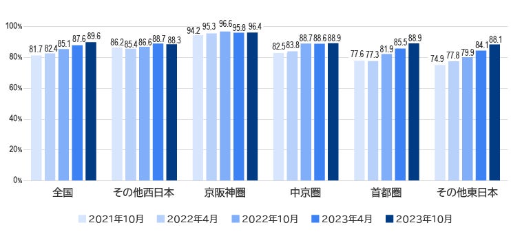 地域別にみると、他の地域に比べ認知度の低いその他東日本でも、前回調査の84.1%から4.0pt上昇し、88.1%となった。
