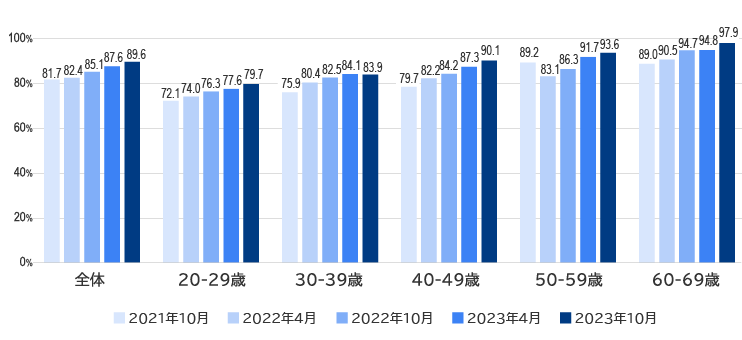年代別でみると、60-69歳や40-49歳代で上昇している。また若年層ほど認知度が低く20-29歳は79.7%、次いで30-39歳が83.9%であった。