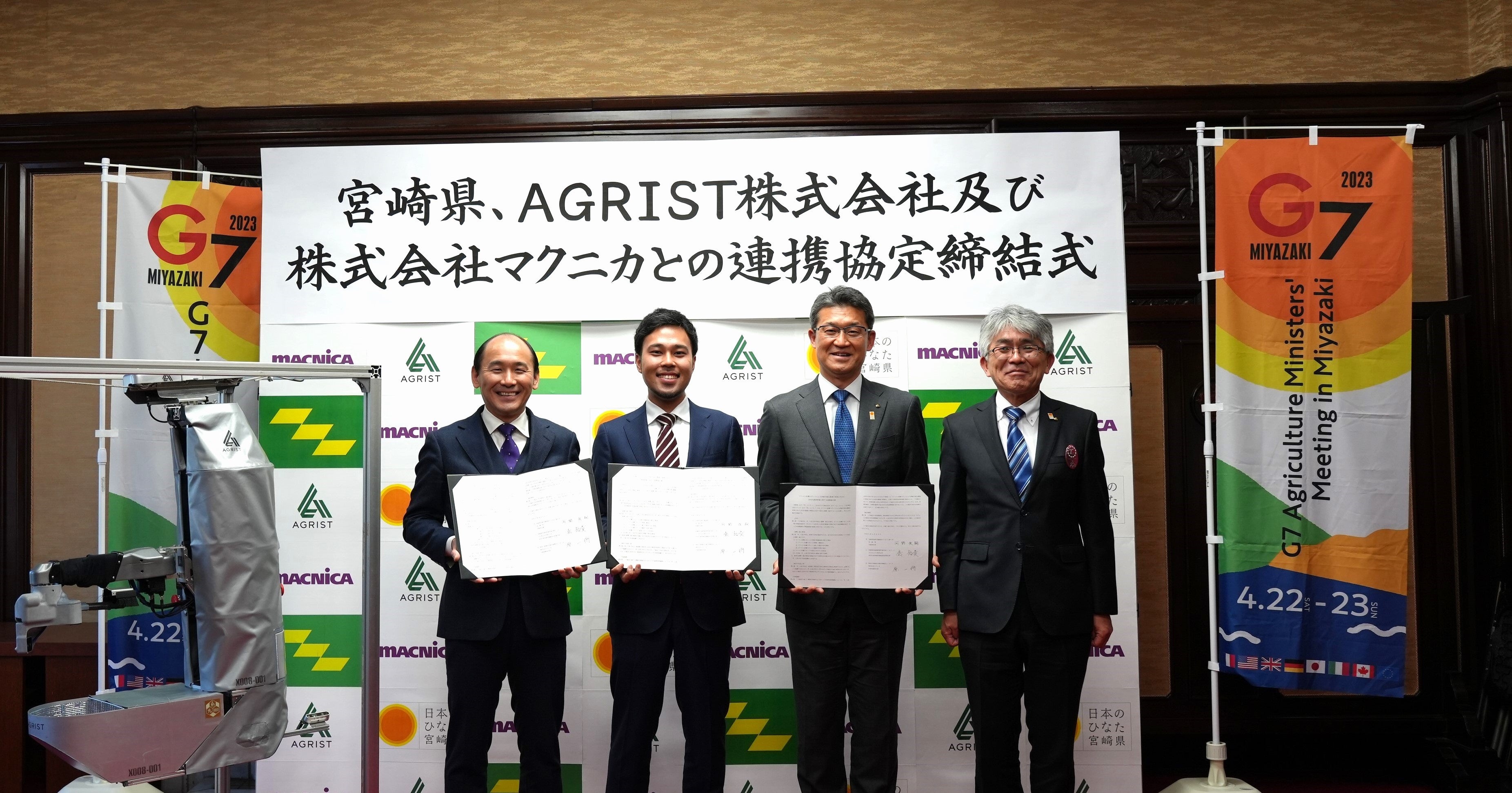 ピーマン自動収穫ロボット「L」の開発を行うAGRIST株式会社(本社:宮崎県新富町、代表取締役:齋藤 潤一、秦 裕貴、以下アグリスト)と、半導体、ネットワーク、サイバーセキュリティ、AI/IoTにおけるトータルサービス・ソリューションプロバイダーの株式会社マクニカ(本社:神奈川県横浜市、代表取締役社長:原 一将、以下マクニカ)は、宮崎県(県知事:河野 俊嗣)と、G7宮崎県農業大臣会合の開催を契機とした宮崎県農業のイノベーションを進めるため、ピーマン収穫ロボットによる持続可能な農業の実現に向けた次世代農業事業を事業化することを目的とする連携協定を本日締結したことを発表いたします。