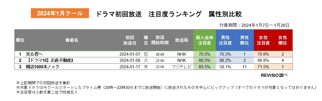 2024年1月クールにスタートした、冬ドラマでプライム帯(20時~22時30分に放送開始)に放送されているドラマをピックアップ*し、REVISIO独自の注目度という指標によって初回放送の「注目度ランキングTOP3」を作成いたしました。その結果、個人全体、男性の1位はNHKの『光る君へ』でした。