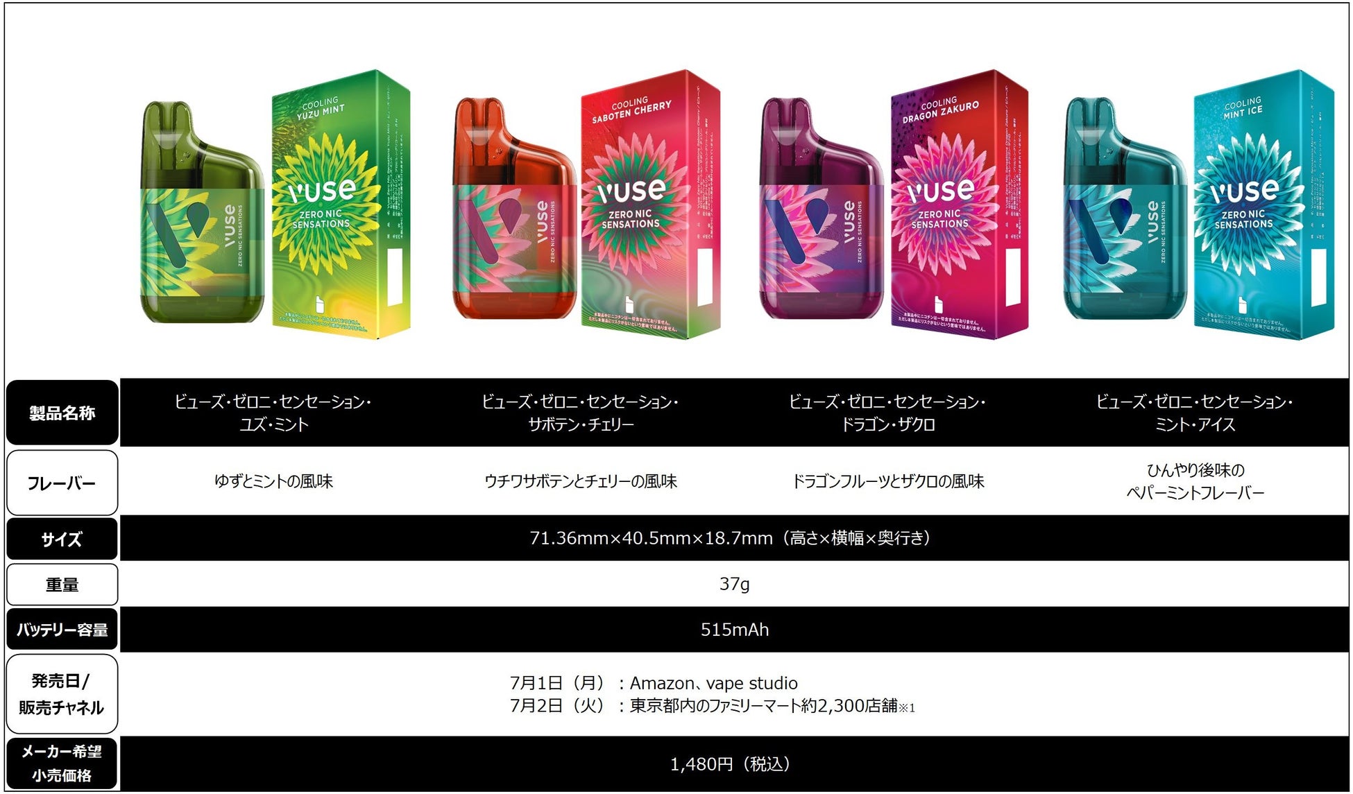 全米No.1シェア(※1)を誇る「Vuse」は、2013年にアメリカで誕生したBATの旗艦ベイプブランドです。充実したフレーバー体験とグローバルレベルのサイエンスを追求した品質を特徴としています。日本では2023年よりゼロニコチンタイプの販売を開始しました。今回、世界初展開となる新モデル「ビューズ・ゼロニ・センセーション」では、ゼロニコチンのベイプ製品のためだけに開発されたリキッドを使用し、また今までにない体験を目指したフレーバーを開発しています。