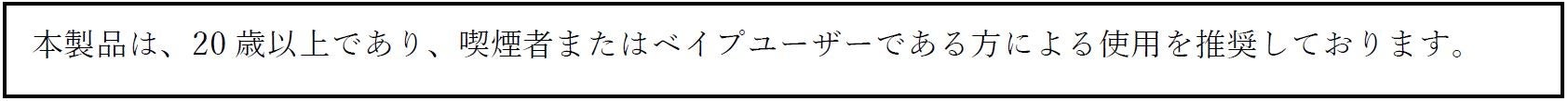 BATグループでは、たばこ製品のマーケティングを適切に実施するために国際的な自主規準を設定しています。そのためベイプ製品に関しても、弊社としては、責任あるマーケティング活動の精神に則り、本製品は20歳以上であり、喫煙者またはベイプユーザーである方による使用を推奨しております。記事掲載していただく際には、「注意文言」が表示されるようご配慮いただきたく存じます。 ご協力の程、何卒よろしくお願い申し上げます。