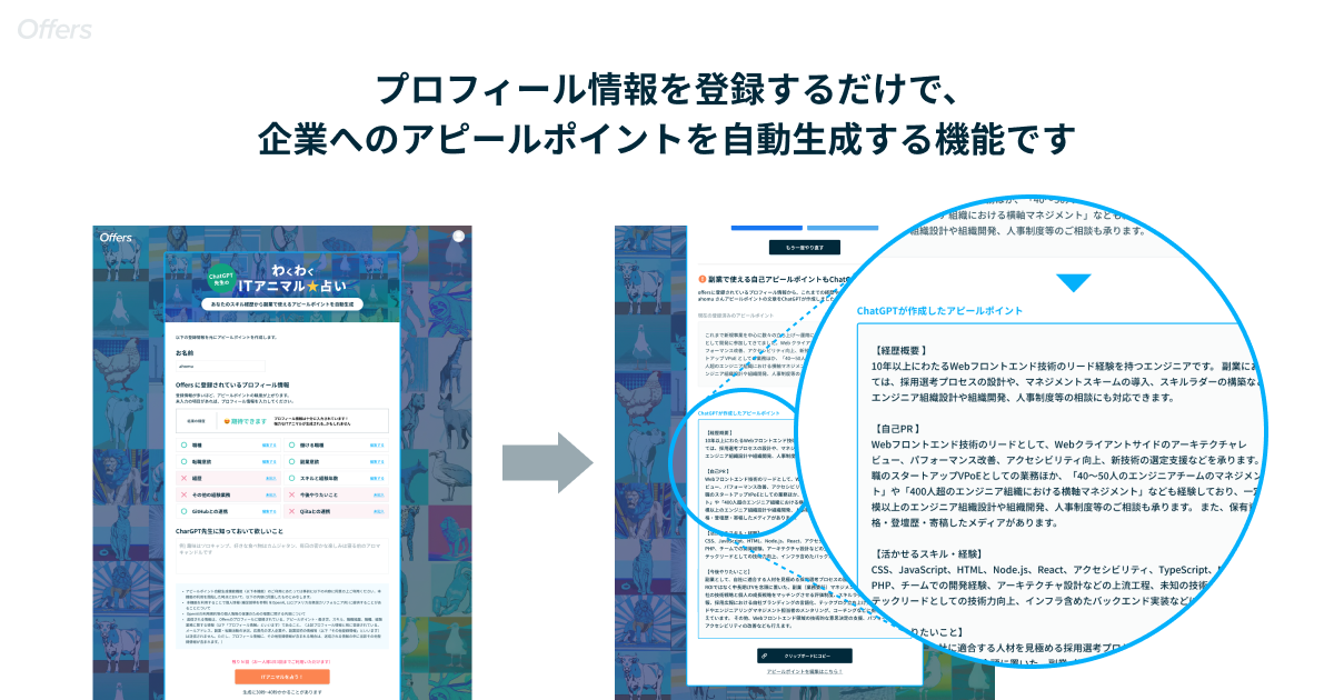 「ChatGPT先生のわくわくITアニマル☆占い」とは、Offersで副業・転職先を探しているITエンジニア/デザイナー(以下、ワーカー)がプロフィール情報を登録するだけで、企業へのアピールポイントを自動生成する機能です。