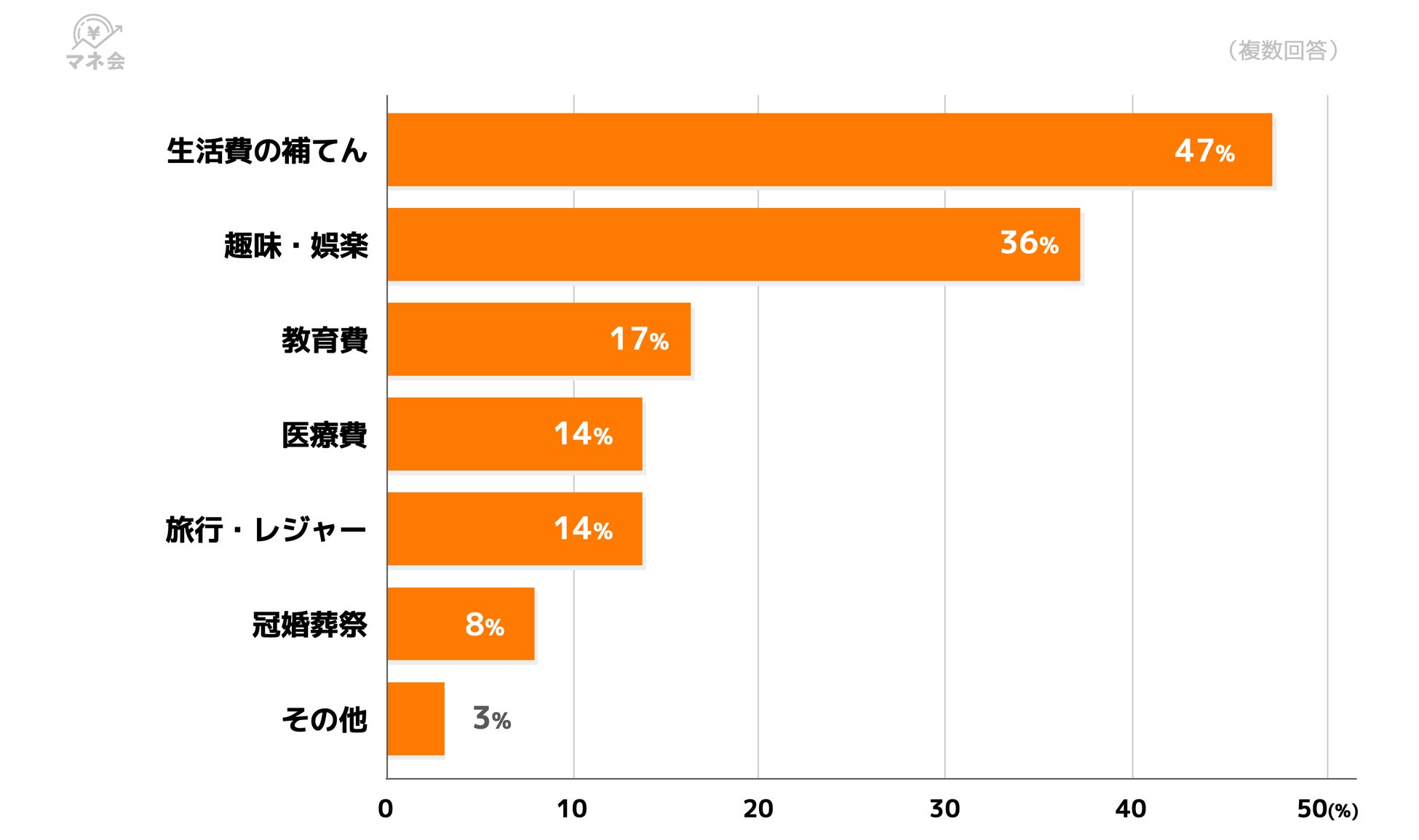 利用経験者に目的を尋ねたところ、最も多かったのは「生活費の補てん」(47%)、次いで「趣味・娯楽」(36%)、「教育費」(17%)、「医療費」(14%)でした。