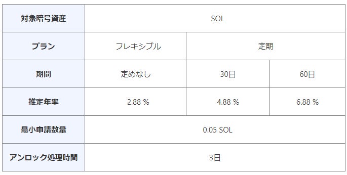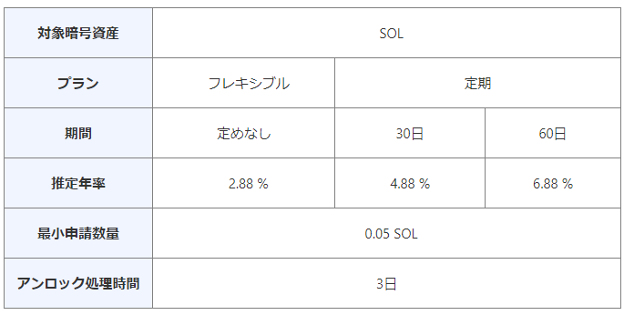 SOLのステーキングサービスでは、ロック期間の制限がない「フレキシブル」プランと、30日・60日のロック期間がある「定期」プランをご用意しており、60日の定期プランでは、最大年率6.88%のステーキング報酬を得ることができます。