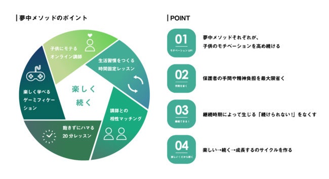 独自の学習メソッドである「夢中メソッド®︎」(※1)を用いたレッスンにより、「GLOBAL CROWN」では半年の継続率94%を実現するなど非常に高いユーザー満足度を達成しています。