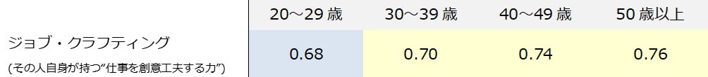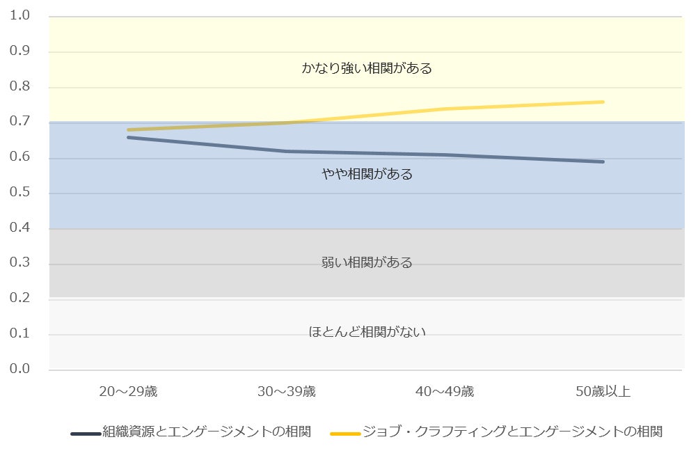 さて、従来、エンゲージメントを高める施策は、給与を上げたり福利厚生を充実させたりといった“組織改善”が主であったが、そのようなアプローチには限界がある。そのようななか、昨今、エンゲージメントを高める要因として、その人自身が持つ自ら“仕事を創意工夫する力”=ジョブ・クラフティングが注目されている。ジョブ・クラフティングが社員のエンゲージメントにどれほど影響しているか、2022年に企業で実施されたエンゲージメント・サーベイの結果を確認したところ、(1)いずれの年代においてもかなり強い相関があり、(2)年代が上がるほど相関が強いことがわかった。つまり、自ら“仕事を創意工夫すること”は、エンゲージメント向上に大きく影響しており、年代が上がるほどその影響が強いといえる。
