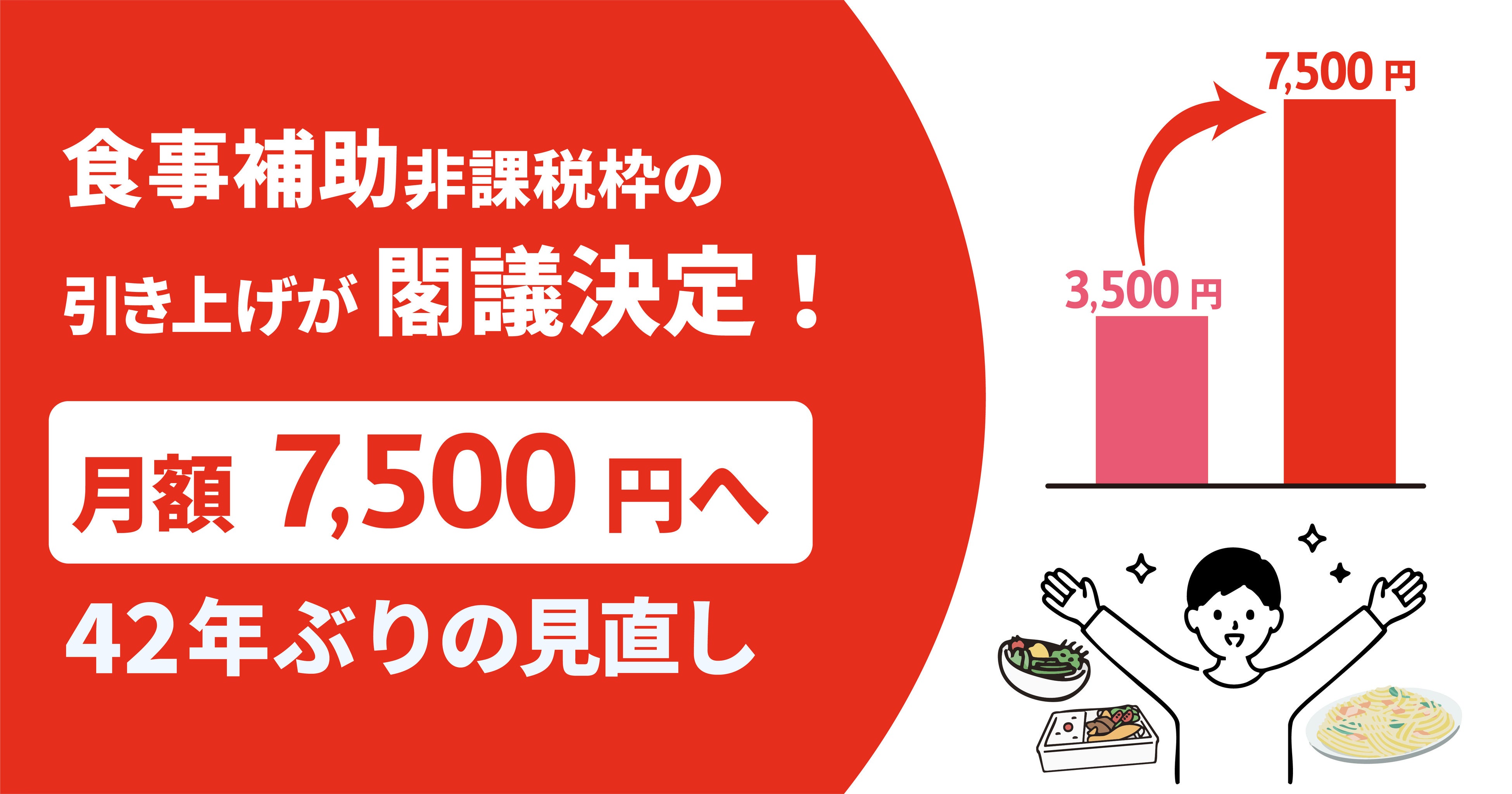 飲食店、食事補助支給企業、食事補助サービス事業者、あわせて1,140者・社で構成される「食事補助上限枠緩和を促進する会」(幹事社:株式会社エデンレッドジャパン)は、政府が2025年12月26日(金)に公表した「令和8年度税制改正の大綱」において、食事支給に係る所得税非課税上限が現行の月額3,500円から7,500円に引き上げ(※)と明記されたことをお知らせします。これは42年ぶりの見直しとなります。