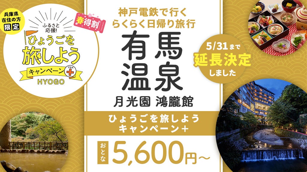 【5月31日迄延長!兵庫県民限定!】5,600円で往復神戸電鉄で行く有馬温泉「月光園 鴻朧館」豪華な昼食付温泉入浴付き日帰り販売開始