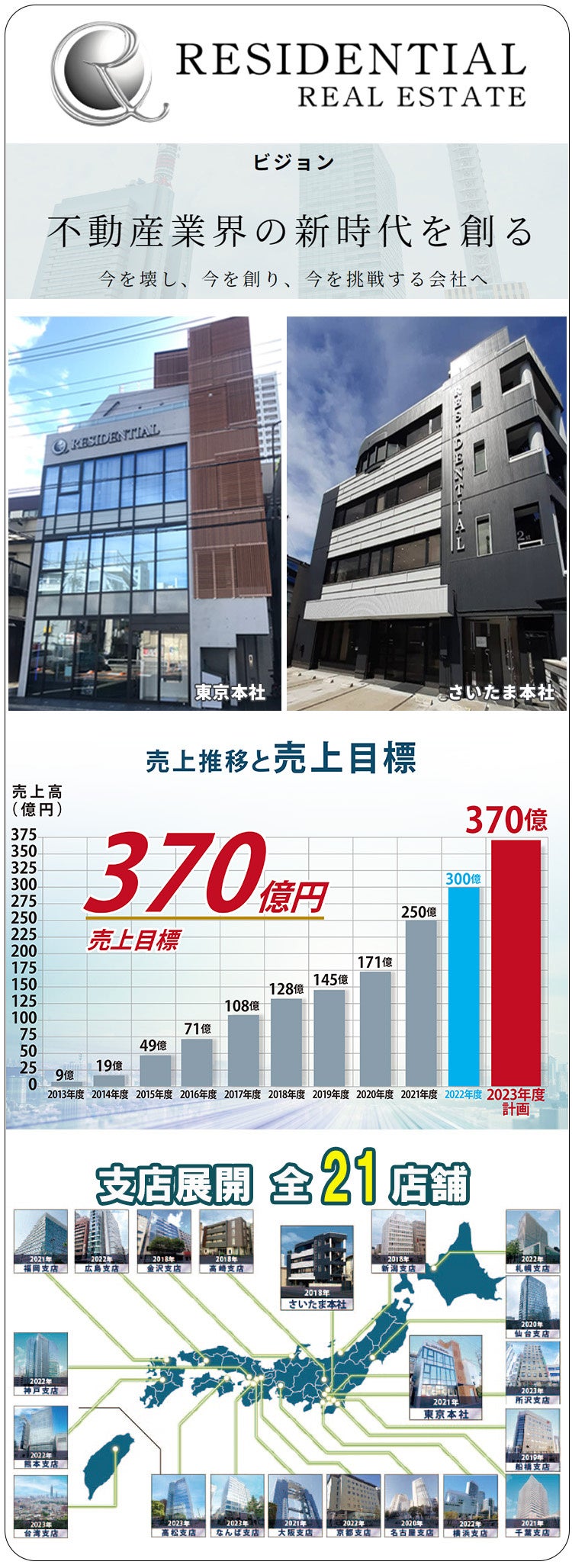 株式会社レジデンシャル不動産は、2012年に設立され、その後約10年で売上高250億円を達成、2023年1月期は売上高300億円を超え、現在急成長中の企業です。事業の中核は「マンションの再生・販売事業」であり、的確なエリアマーケティングや、コストパフォーマンスが同社の強みです。