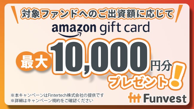 本ファンドへ出資していただいた投資家の皆様を対象として、出資額に応じて最大10,000円分のAmazonギフトカードをプレゼントするキャンペーンも併せて実施いたします。