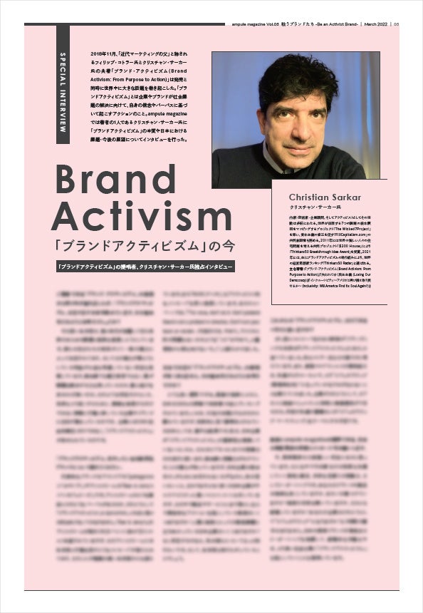 この度発行した「ampule magazine Vol.3」のテーマは、「戦うブランドたち -Be an Activist Brand-」。昨今注目を集める「ブランドアクティビズム(※)」について、『ブランド・アクティビズム』の著者であるクリスチャン・サーカー氏への独占インタビューをはじめ、社会課題への関心が強いとされる「Z世代」への意識調査や、ブランドアクティビズムに取り組む企業の国内外の事例などから深掘り。ブランドアクティビズムの「今」と「これから」を探ります。
