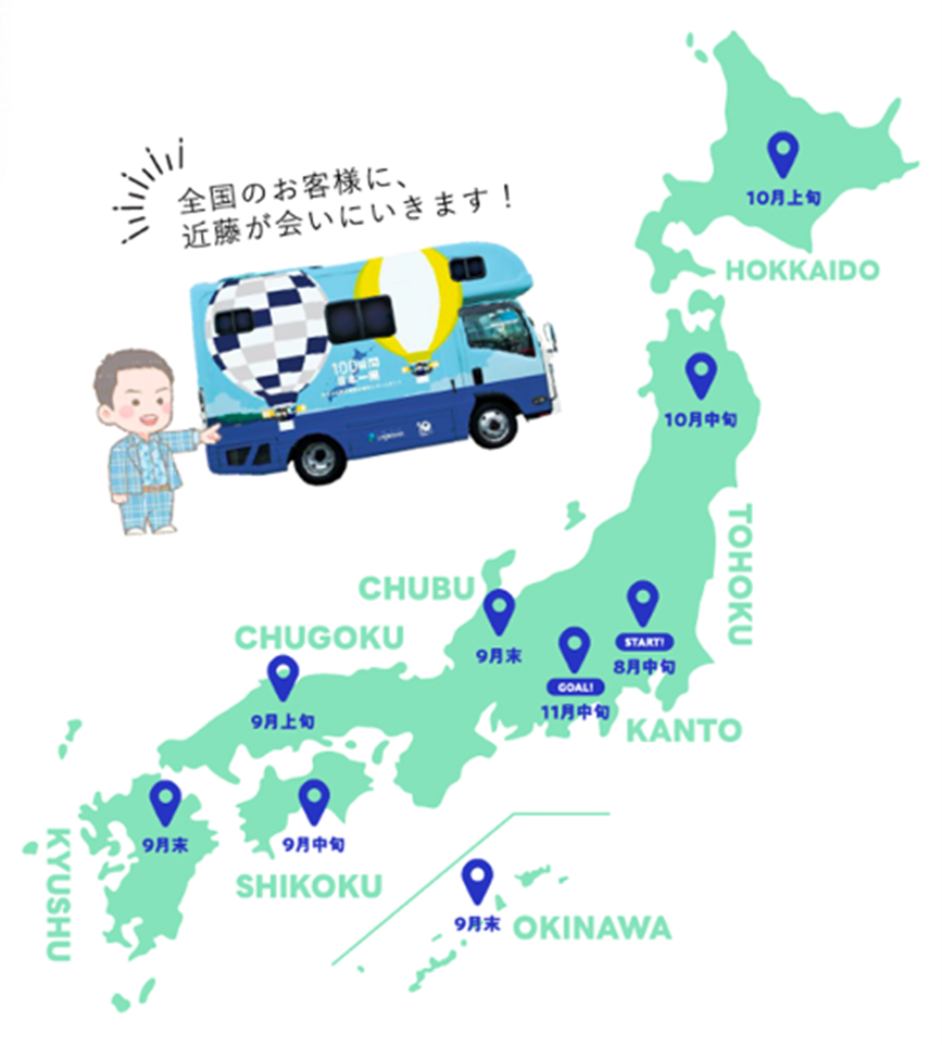 10周年事業として、代表の近藤が8月4日から100日間をかけて全国行脚を始動。自らオリジナルキャンピングカーを使って、これまでお世話になった全国約300社の取引先企業のもとに直接足を運びます。10年の感謝を伝えるとともに、現在企業活動で求められるやりがいの創出、多様な働き方、サステナビリティ、DX化推進などのテーマでディスカッションを行い、次の一歩の解決策を提案します。