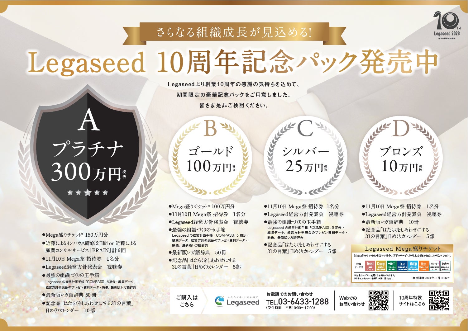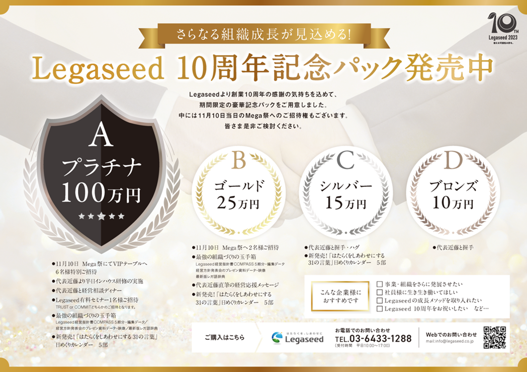 当社は平均年齢28歳の組織でありながら、毎年黒字経営を続け、組織診断サーベイでも高スコアを継続するなど、自社を実験台としながら、人と組織の成長に必要な実践的な取り組みを行っています。これらはすべて創業以来、過去に蒔いた種が芽生えた結果です。10周年事業のコンセプトは「Megaseed」。これまでの私たちの活動に賛同いただいたお客様一人ひとりに多大なる感謝を伝え、今後の組織経営づくりにより花を咲かせたいという想いや、10周年を皮切りにさらなる大きな種を蒔きよりよい社会を創造する決意を表しています。