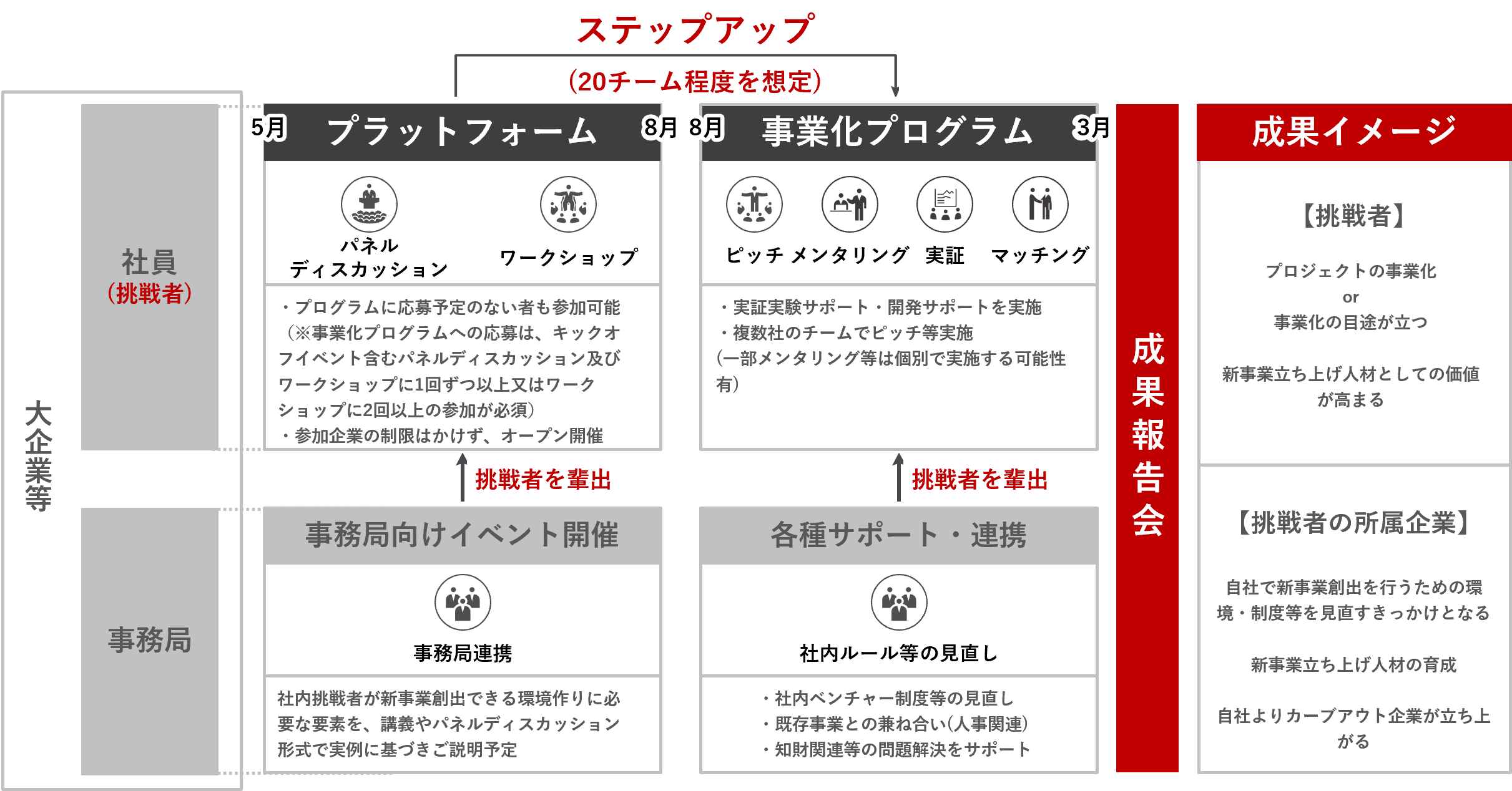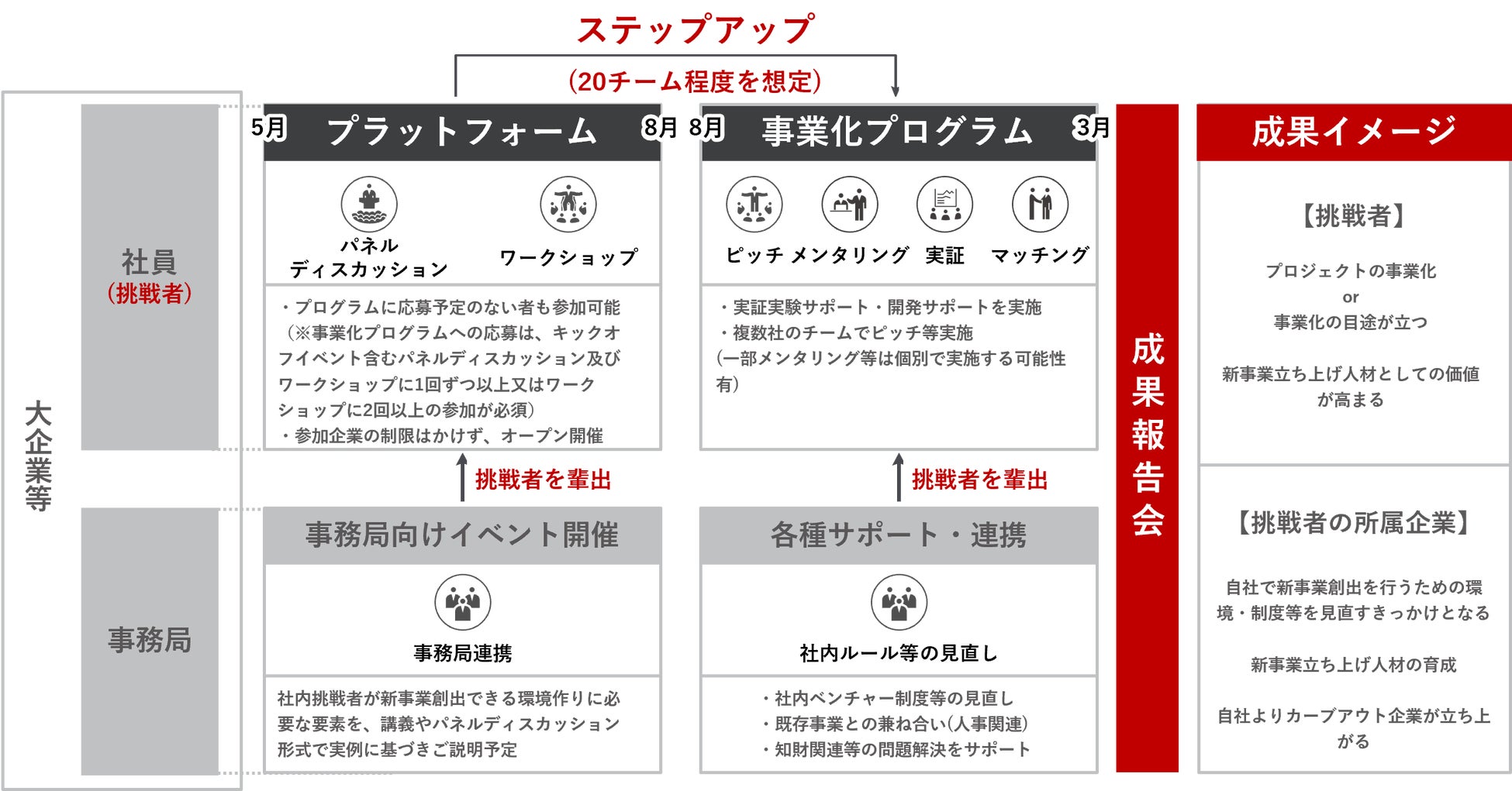 本事業では、社員が企業に属しながら新事業を立ち上げるために、分野を超えた起業家やベンチャーキャピタリスト、その他各分野のプロフェッショナルの方々に協力をいただき、事業化に向けたサポートを実施いたします。