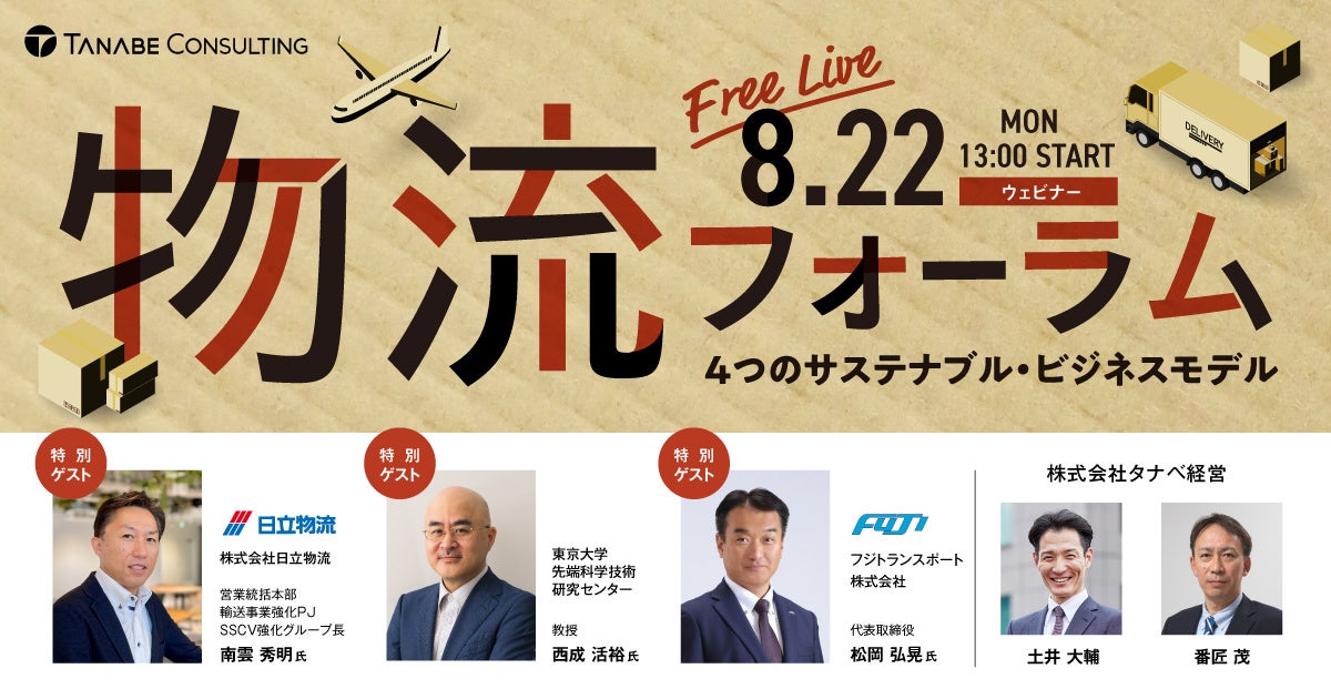 本フォーラムでは、フジトランスポート株式会社 代表取締役 松岡 弘晃 氏、株式会社日立物流 営業統括本部 輸送事業強化PJ SSCV強化グループ長 南雲 秀明 氏、東京大学先端科学技術研究センター 教授 西成 活裕 氏のゲスト3名にご登壇いただき、成功するDX推進・人材育成、M&Aのポイントなどについてご講演いただきます。また、タナベ経営のトップコンサルタントより、「国内物流会社のサステナブルモデル」、「人が集まる物流会社のビジョン構築」について提言いたします。