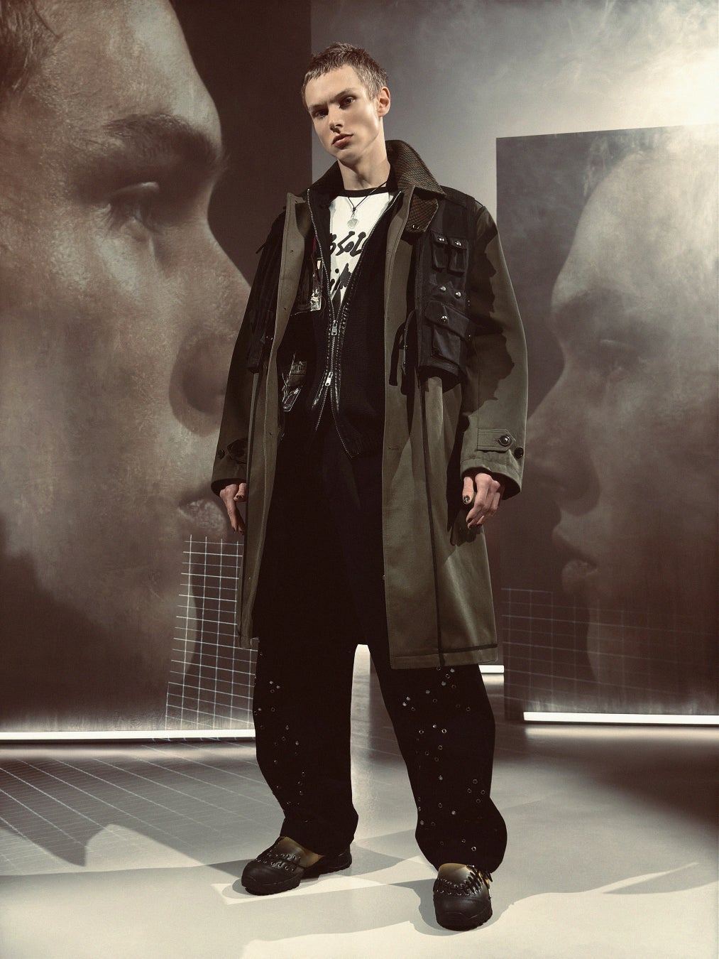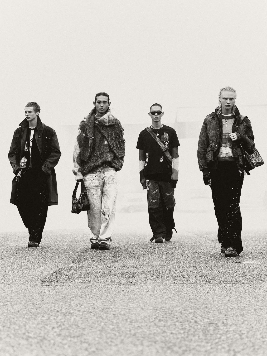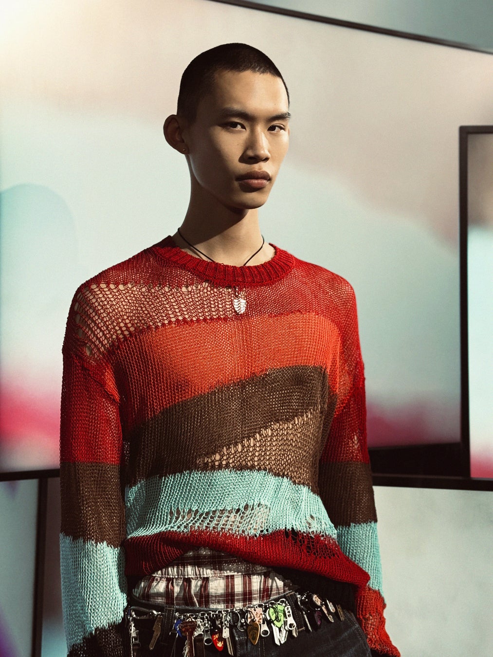 コレクションのハイライトには、デザイナーお気に入りのレザージャケットが登場。デニムのように見えるトロンプ・ルイユ加工が施され、リアルな視覚効果を生み出します。コットンフランネルシャツは、異なるチェック柄を大胆に組み合わせ、デニム風のプリントを重ねたデザインが特徴的です。さらに、Tシャツやニットウェアはパッチや異素材を組み合わせることによって、新たなシルエットと質感を表現。ニットはソフトかつセミシアーな仕上がりで、ウールパンツにはメタル製のハトメ(グロメット)を星座のように散りばめたデザインが施されています。