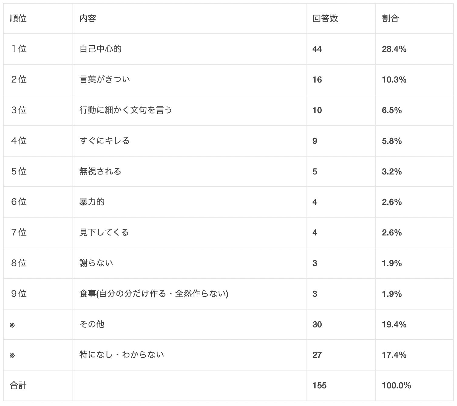 以下「すぐにキレる」「無視される」「暴力的」「見下してくる」などの結果になっています。