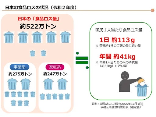 日本の食品ロスは年間522万トン発生しています(R2農水省推計)。この数字は、日本国民が毎日お茶碗一杯分のご飯を廃棄しているのと相当します。この食品ロスのうち、約53%が事業系食品ロスが占めており、農林水産省は、食品流通過程で発生する3分の1ルール(※)の見直しを進めています。